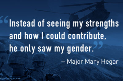 Major Mary Jennings Hegar served three tours over two deployments to Afghanistan, and trained as a California Air National Guard Combat Search and Rescue (CSAR) pilot after serving 5 years in the Air Force. She was awarded the Purple Heart and the Distinguished Flying Cross with a Valor Device for heroism while participating in an aerial mission near Kandahar Airfield on July 29, 2009. She is currently a plaintiff in an ACLU lawsuit challenging the military’s policy excluding women from many combat positions.