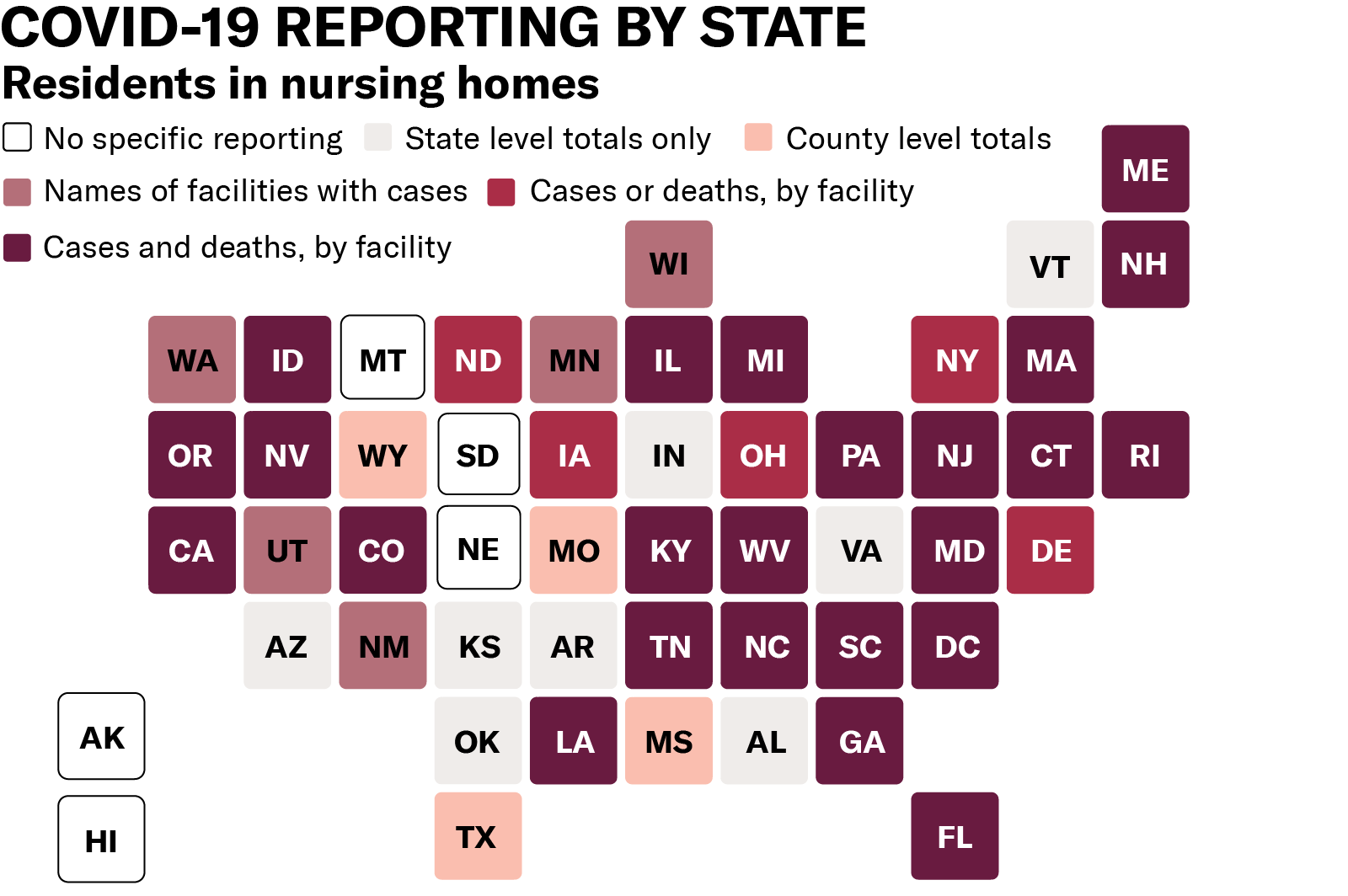 The first step to change the system is to get to the truth. HHS must tell the truth about what is happening in the nursing homes and other congregate settings for people with disabilities that it oversees and funds with our taxpayer dollars. Maps reflect public data reporting as of 06/29/2020. Links to state-level data sources available here.
