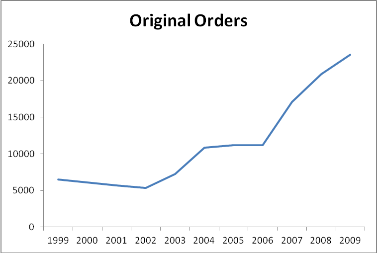 During the last decade’s data blackouts, privacy advocates feared that the use of pen registers and trap and trace devices had become much more frequent, but they had no data with which to properly assess the situation. FOIA litigation by Chris Soghoian in 2010 uncovered data confirming these suspicions. From 2006 to 2009, while the DOJ evaded Congressional oversight, it also radically and suddenly increased the annual number of orders for pen registers and trap and trace devices. As the chart below shows, the annual number of original orders for pen registers and trap and trace devices doubled between 2006 and 2009 from 11,000 to 24,000 (though the government may have sought numerous extensions on those original orders).