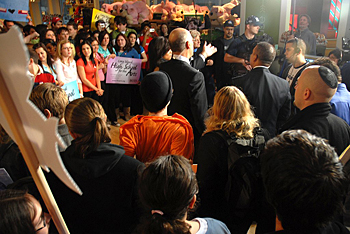 8:22 a.m.: Harry points to me and says "I want you up here." I return to the front. The entire crowd applauds. The head security guy is fuming. He is on the phone, telling someone about our shirts and that Harry Smith just invited us back up to the front. In a minute, a very polished CBS exec sweeps into the room. She tells me to move back. I tell her Harry invited me up.Harry has conveniently gone stage left and buried himself in a group of high school students. He's mugging for photos and laughing, watching CBS exec out of the corner of his eye. Eventually, they conference center stage. He exclaims — for the crowd — "Come on, it's the Beatles! It's the 60's for god's sake. She can stay." The crowd goes nuts again.