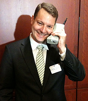 Way back in 1986…Cell phones were the size of bricks. In this photo, ACLU Privacy Lobbyist Chris Calabrese models the Zack Morris phone.