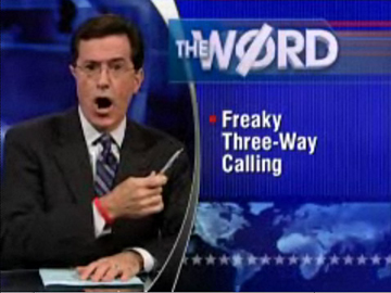 Nonetheless, last week's reports sound like some kind of joke. That the government has wasted our tax dollars and intelligence resources listening to transatlantic phone sex seems better suited to The Onion than to ABC News. It's only logical, then, that perhaps some of the most scathing coverage of the scandal came from comedian Stephen Colbert, whose recent report on the program ("The Word: Freaky Three-Way Calling") hit home as much as that of any of the pundits:
