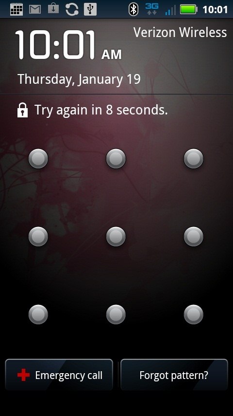 After five incorrect attempts to enter the screen unlock pattern, Android will reveal a “forgot pattern?” button, which provides the user with an alternate way method of gaining access: By entering the Google account email address and password that is already associated with the device (for email and the App Market, for example). After the user has incorrectly attempted to unlock the screen unlock pattern 20 times, the device will lock itself until the user enters a correct username/password.