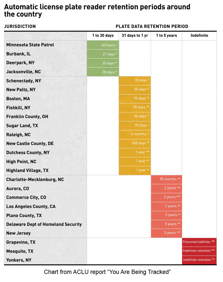 But unfortunately, right now the Minnesota State Patrol is almost alone in these privacy protective practices. Almost all agencies that responded to our records requests kept their data for longer than 48 hours, with the length of time ranging anywhere from about a month to a few years or even forever. There’s a total lack of consistency when it comes to these policies, and many agencies are like Grapevine, following no policy at all and keeping their data indefinitely.