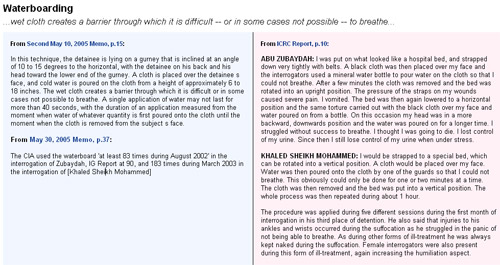 If you’ve read the torture memos, you’ve probably noticed the technical and detached language used by government lawyers to describe and authorize specific interrogation techniques, including facial slaps, stress positions, sleep deprivation, nudity and waterboarding. Compared against prisoners’ own accounts of their treatment, the differences between descriptions are striking.