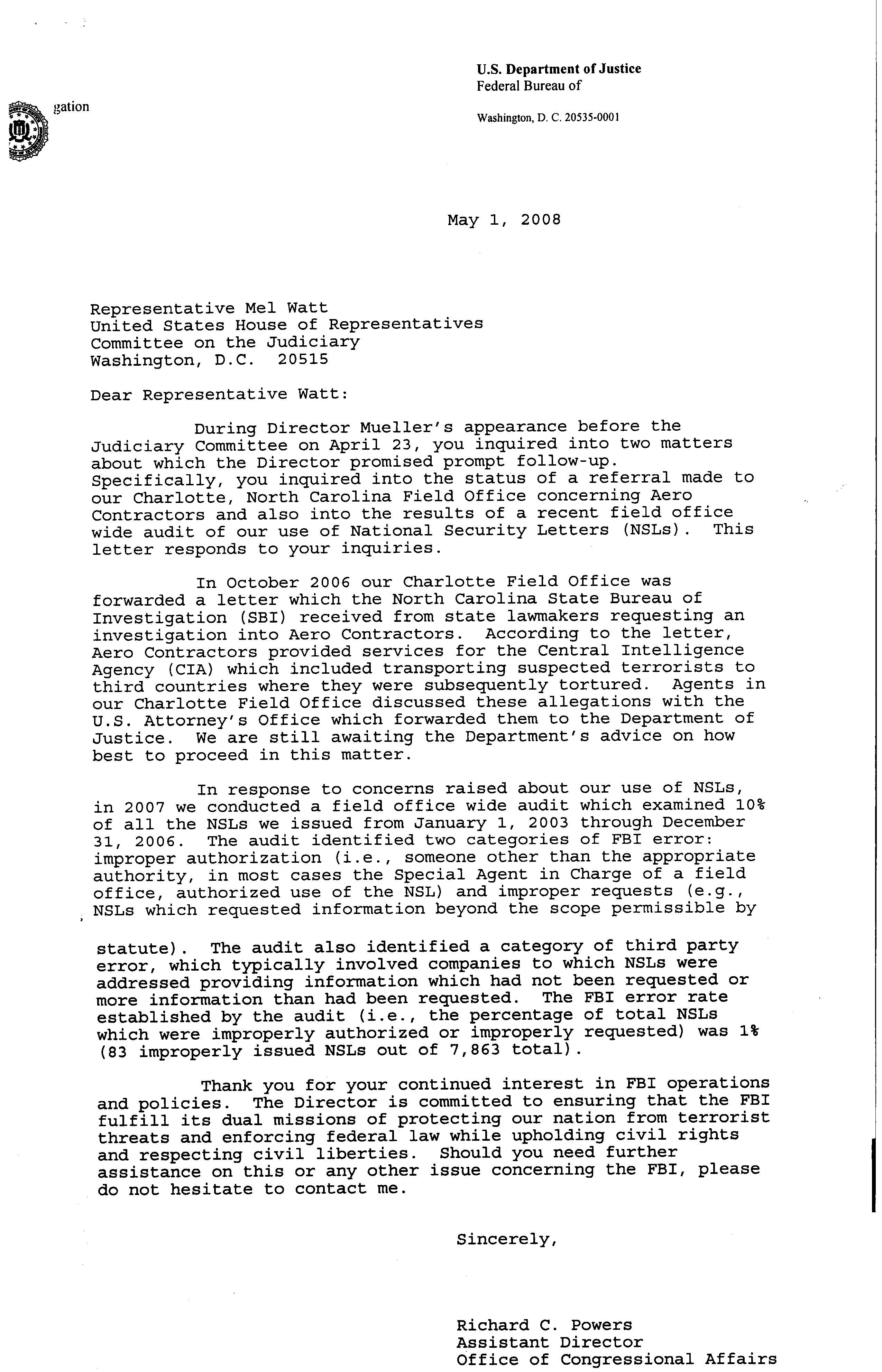 When the State instead passed the buck to the FBI, U.S. Rep. Mel Watt (D-N.C.) followed up in April 2008 (PDF), questioning FBI Director Mueller in an oversight hearing about progress with the Aero investigation. The FBI later responded that it had asked Bush’s DOJ for guidance, and had received none. In July 2008, U.S. Rep. David Price (D-N.C.) wrote to the leaders of the House Intelligence Committee, calling for investigation of Aero Contractors and other private rendition contractors.
