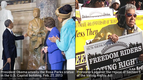 Contrast these very real challenges with a joyous and historic event that started an hour after the Shelby oral argument right across the street. Inside the United States Capitol (an edifice built with slave labor), in a ceremony filled with all of the pomp and circumstance afforded to presidents and war heroes, Congress unveiled a life size statue of Rosa Parks. Parks ignited the Montgomery bus desegregation boycott by being arrested for refusing to give her seat to a white passenger. Her statue sits among of a cluster of white men encircling the round hall, and falls within the gaze of the statue of Jefferson Davis, the president of the Confederacy during the Civil War.