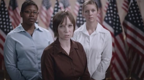The first ad, “Denied,” features three female veterans – Dottie Guy, Kayla Williams and Shannon Clark, who have recently returned from war zones in Iraq and Afghanistan. In the ad they speak passionately on behalf of women currently serving in the military. Seated in front of a bank of American flags, each shares a part of the following: “As a soldier in Iraq, I put my life on the line to protect and defend my country. I fought for the freedom and justice our country stands for. Yet, I’m denied proper reproductive health care benefits; denied abortion care even if I’m the victim of rape. I expected the horror of war in Iraq – but I expected better from my own government.”