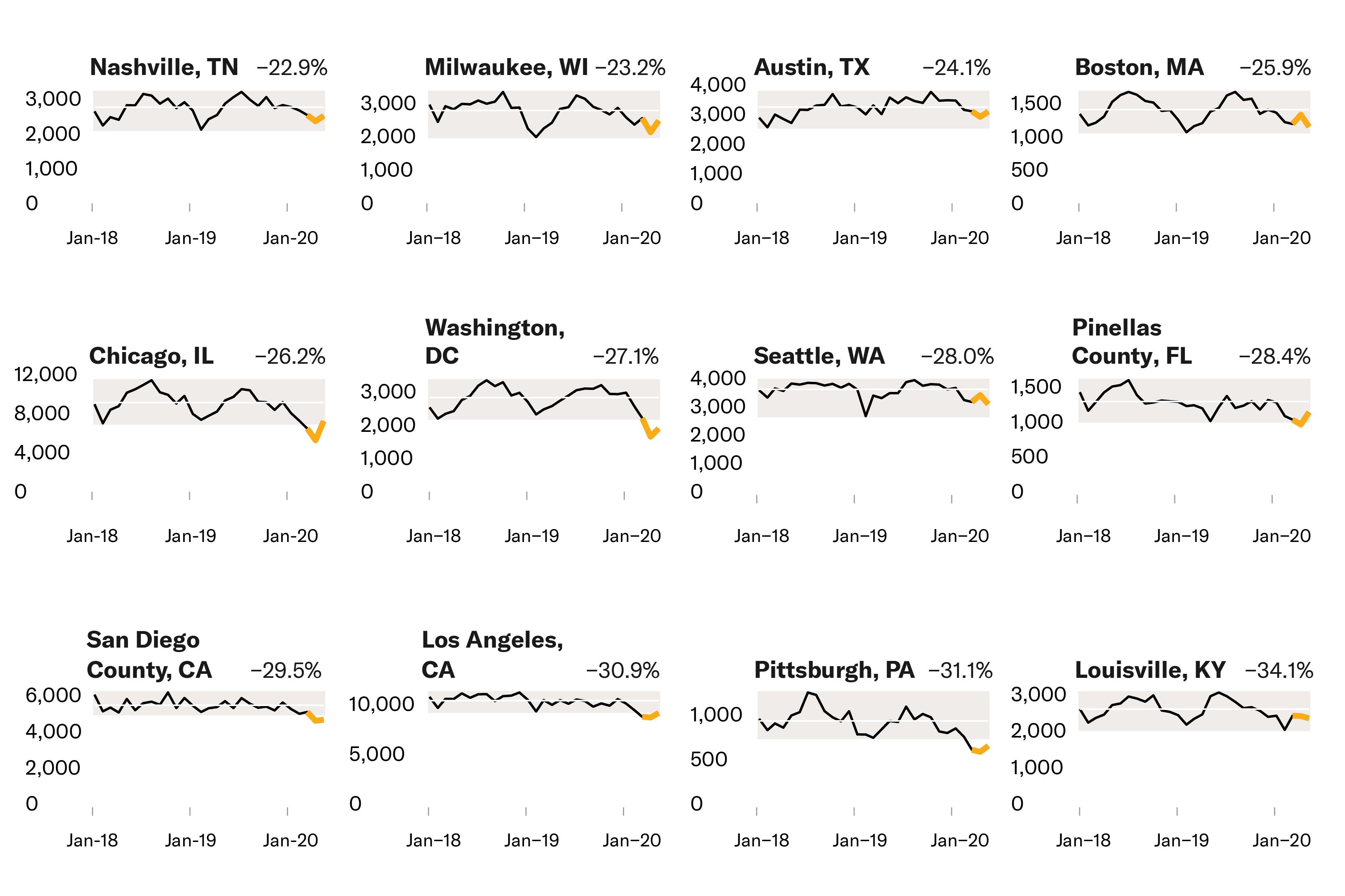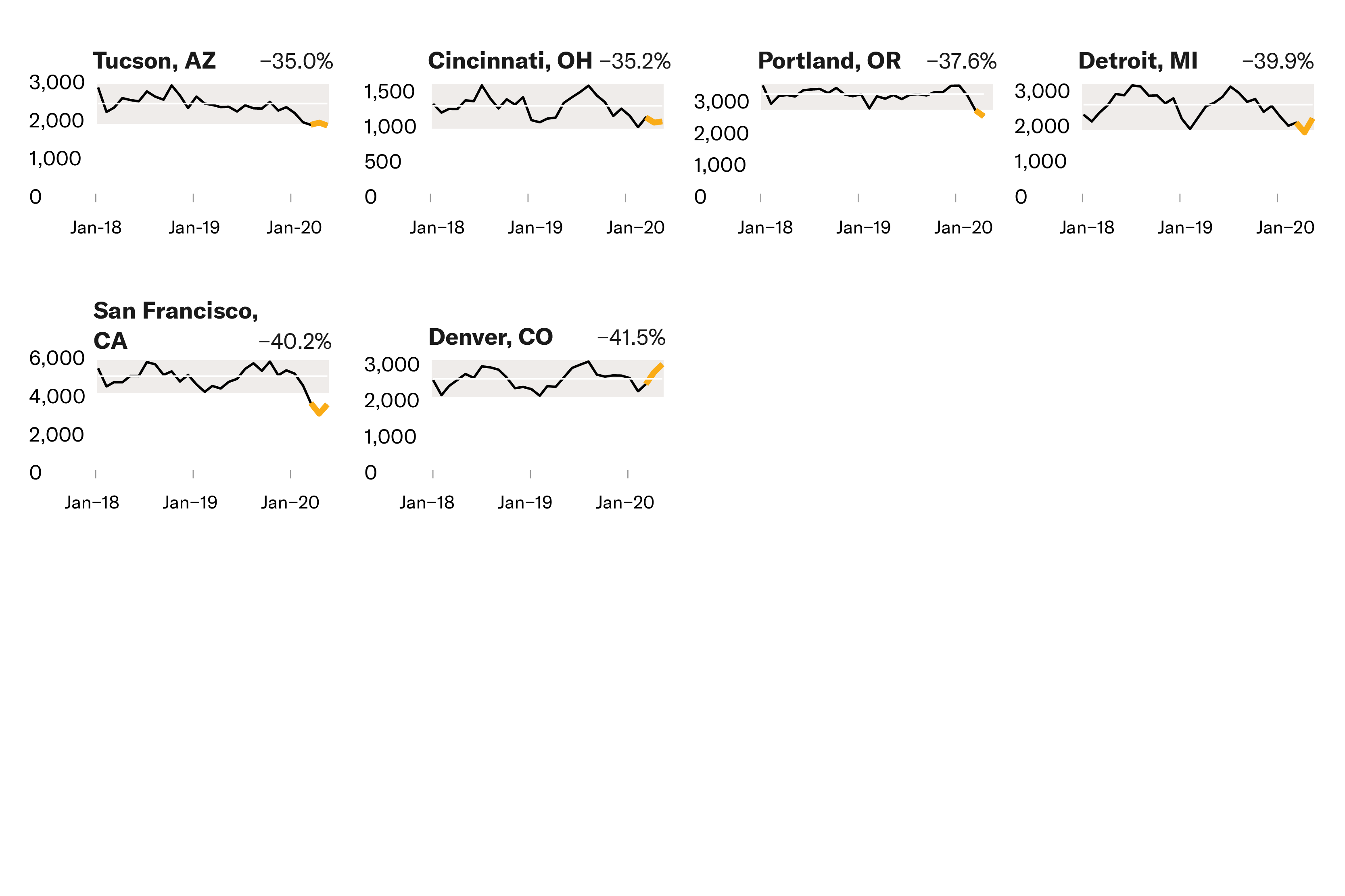 - When calculating the percent change in crimes between 2020 and 2019, we used the average number of crimes between March and May for both years. One exception was Portland, OR, where data was only available through April 2020. We calculated the percent change using just March and April data for both years.
