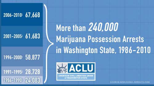 The ACLU has long opposed the War on Drugs and its criminalization of marijuana. ACLU of Washington support for I-502 is part of our broader work of criminal justice reform. Our state and nation’s unfair marijuana policies have damaged civil liberties in many ways – eroding constitutional protections against searches and seizures, putting large numbers of non-violent individuals behind bars, and disproportionately targeting people of color. Over the last 25 years, there were almost a quarter-million arrests of adults in Washington for marijuana possession. And though African Americans, Latinos, and Native Americans combined constituted 14 percent of Washington's population, from 2001 through 2010 they accounted for 25 percent of marijuana-possession arrests – even though use rates are similar to those of whites.